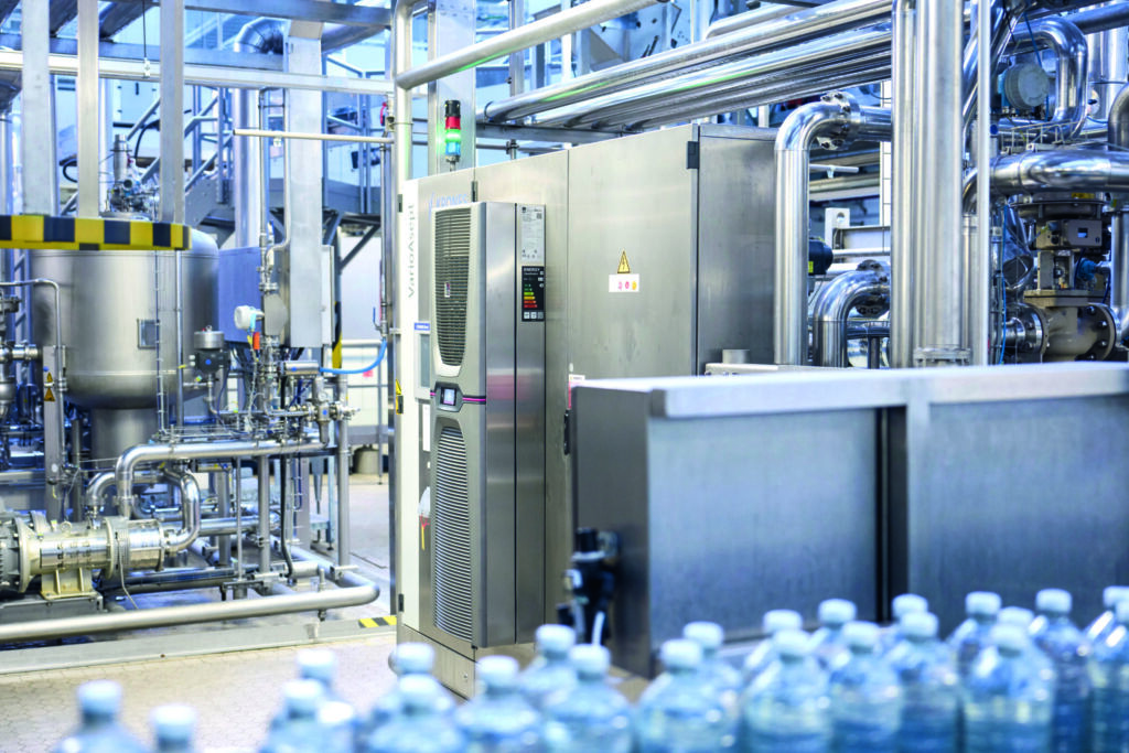 Während vorne die Flaschen vorbeirattern, erfüllen die Rittal Blue e+ Kühlgeräte ihren Dienst - in den Hallen des Abfüllwerks können durch die Jahreszeiten starke Temperaturschwankungen entstehen.
